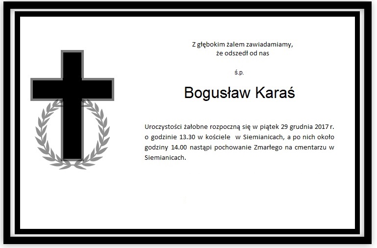 informujemy, że uroczystości pogrzebowe Ś.P. Bogusława Karasia odbędą się w piątek, 29 grudnia 2017 roku w kościele w Siemianicach o godzinie 13.30, po czym nastąpi odprowadzenie na cmentarz w Siemianicach.