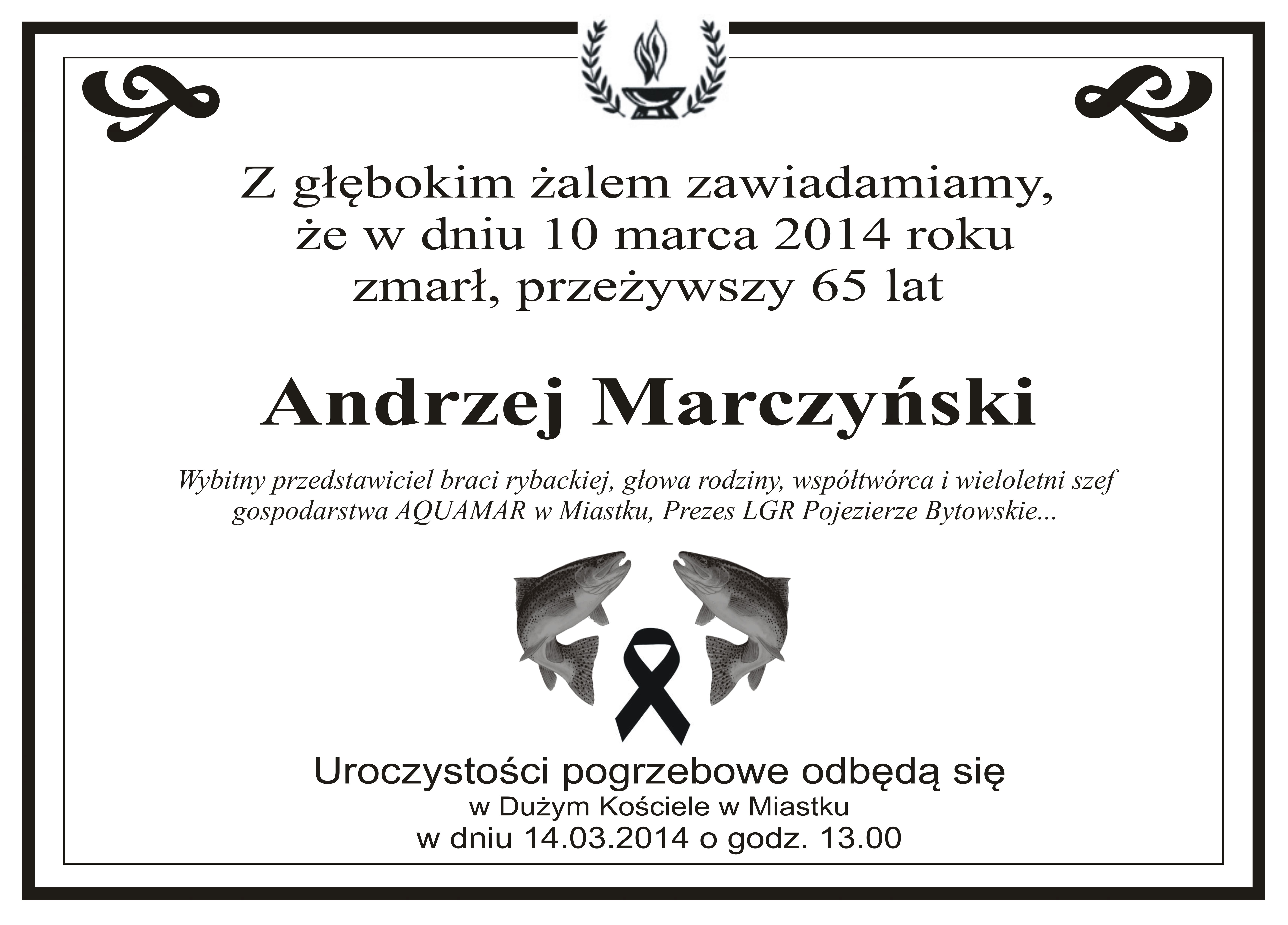 W dniu dzisiejszym odszedł Andrzej Marczyński, nasz kolega i szef gospodarstwa Aquamar w Miastku...