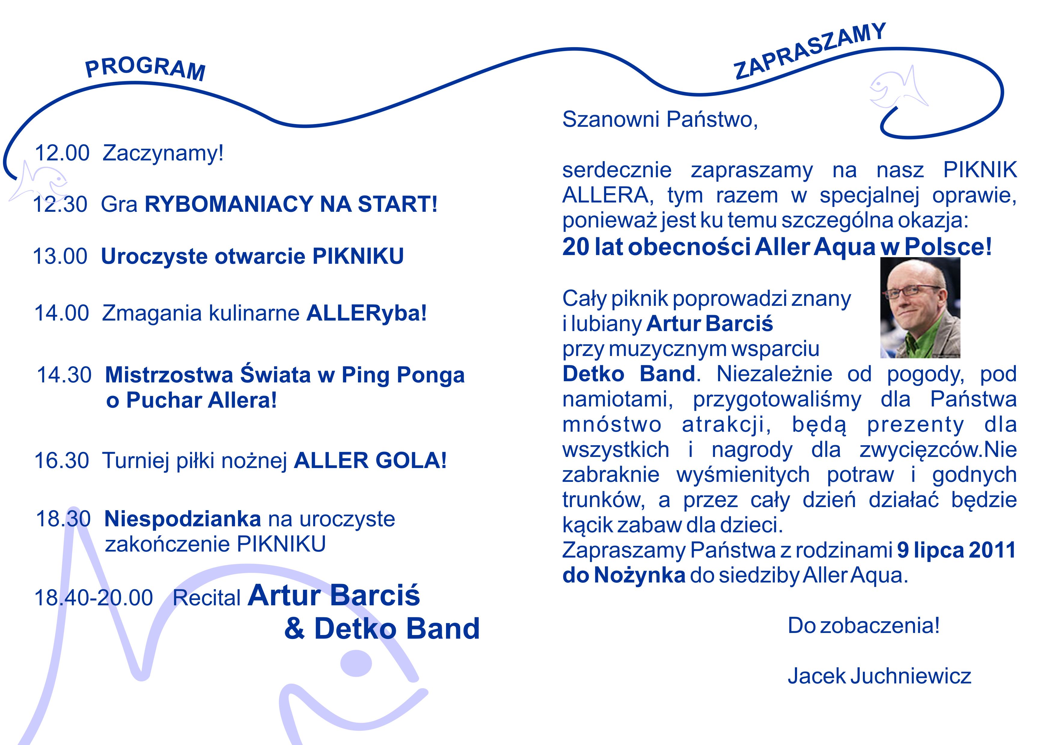 W imieniu firmy Aller Aqua zapraszamy na Piknik z okazji XX-lecia firmy, jaki odbędzie się w Nożynku 9 lipca br.
